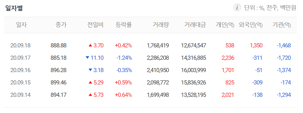 지난 주 코스닥 시장은 그 전 주인 9월 11일 장 마감(888.44) 보다 0.44 포인트 오른 888.88로 마감하면서 주간 단위로 볼 때 큰 변동은 없었습니다.