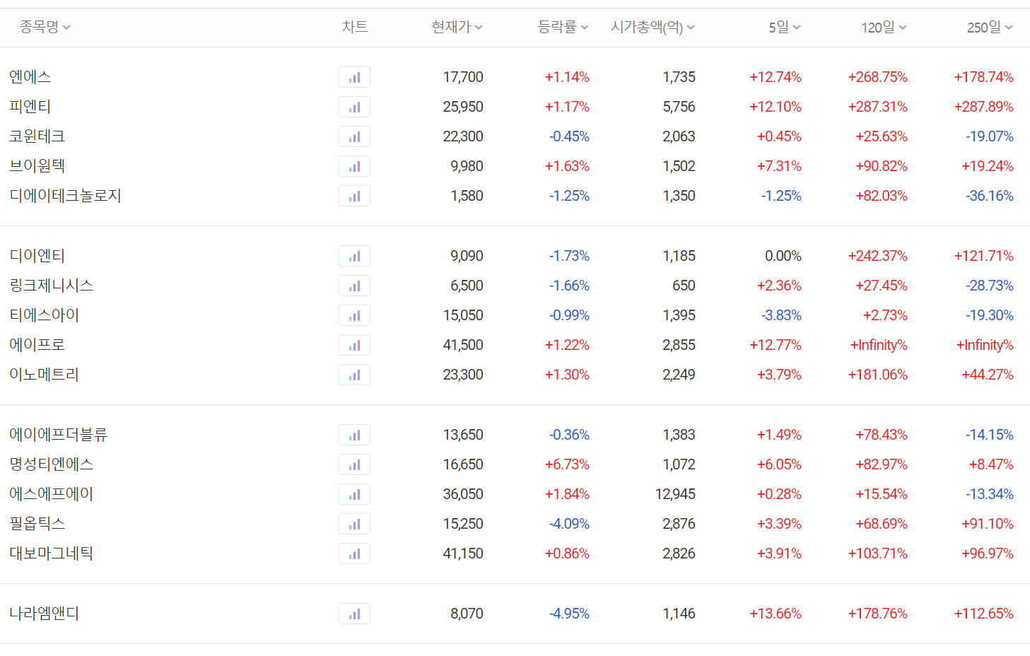 지난주 2차전지 장비 관련 주는 엔에스(12.74%), 피엔티(12.10%), 에이프로(12.77%), 나라엠앤디(13.66%) 등이 상승하였습니다.