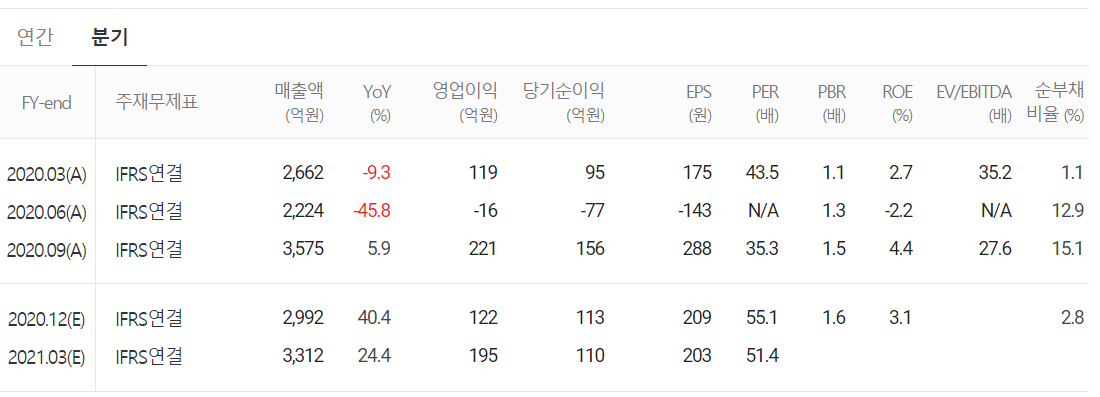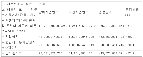 당사의 2020년 결산 실적(잠정치)에는 매출액 1조 1793억 원으로 전년 대비 6.0% 감소했고, 영업이익 420억 원으로 60.1% 감소, 당기순이익 206억 원으로 67.9% 감소했습니다.