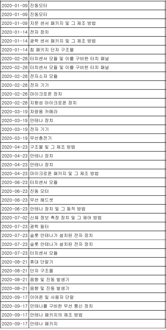 당사는 당사의 사업과 연관된 186건의 특허를 보유하고 있으며, 2020년 한 해 동안 54건의 특허를 취득할 정도로 연구개발에 몰두하고 있습니다. 최근 특허 현황을 보면 자동차용 카메라 모듈 등 기존의 휴대폰용 부품 부문 외에도 사업 다각화를 위한 기술 내재화가 이루어지고 있는 것을 알 수 있습니다.