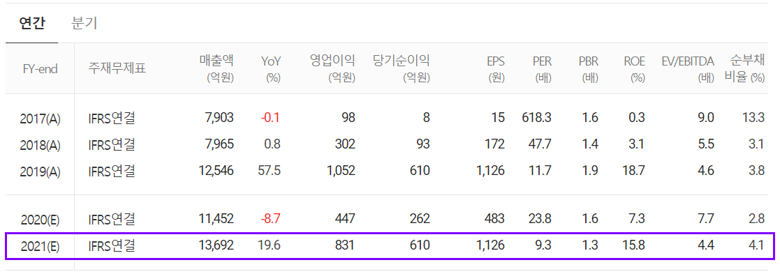 2021년에는 연매출 1조 3,692억 원으로 전년 대비 16.11% 증가하고, 영업이익은 831억 원으로 97.9% 증가할 것으로 추정했습니다. 당사 신규 부품 사업에 대한 매출 확대, 자동차 전장 분야에 대한 매출 기대가 반영된 것 같습니다.