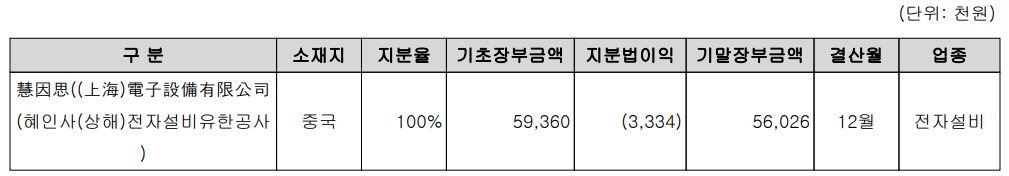 당사는 당분기 중, 중국 상해에 유지보수를 목적으로 하는 현지 법인을 설립하였습니다.