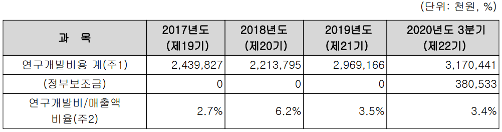 최근 당사의 연구개발 비용은 전체 매출액의 3% 중반 대를 투자하고 있습니다.