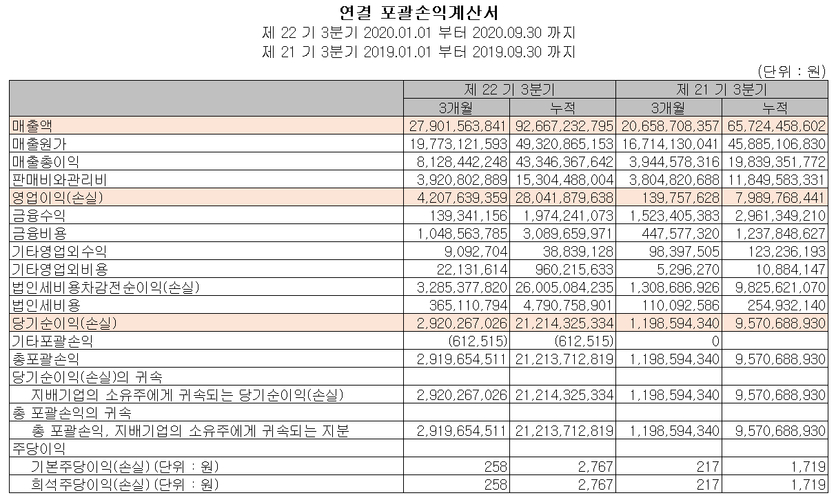 당사가 지난 2월 8일 공시한 잠정 실적에 의하면, 2020년 매출액은 1,062억 원으로 전년 대비 24.9% 증가했고, 영업이익은 250억 원으로 224.3%, 당기순이익은 169억 원으로 99.7% 증가하는 등 사상 최고 실적을 달성했습니다. 매출 추이에서 나타난 것처럼 주요 실적 개선은 수출의 증가에 따른 것으로 알려졌습니다. 주 고객사인 삼성디스플레이의 투자가 본격화되면서 2021년이 더 기대되는 기업입니다.