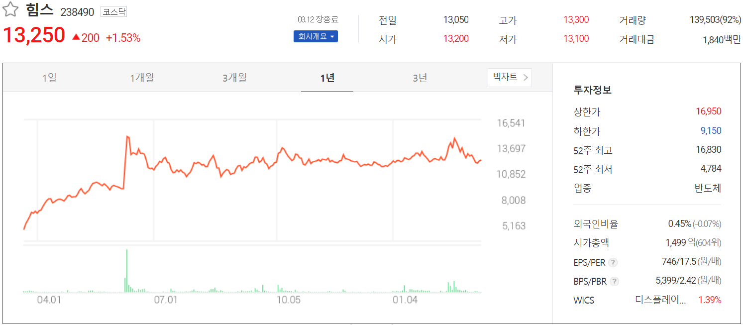 3월 12일 장 종료 기준 힘스의 주가는 13,250원에 거래를 마쳤습니다. 외국인 비중은 0.45%이며, 시가 총액 1,499억 원으로 코스닥 시총 상위 604위 종목입니다.