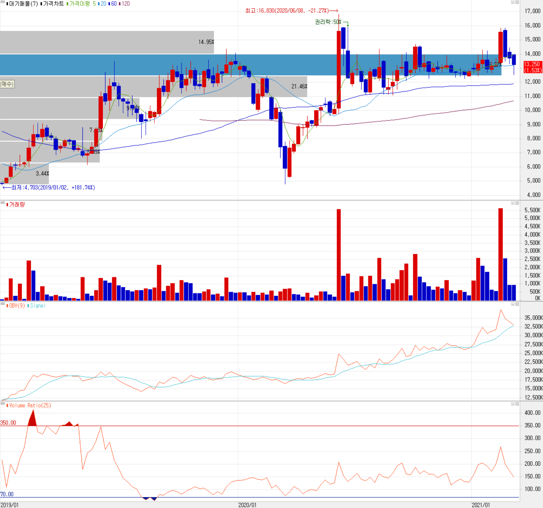 당사의 주가를 보면 작년 코로나19 팬데믹으로 인한 낙폭을 만회하자마자 6월 중순에 무상증자가 결정되면서 큰 폭의 상승이 있었습니다. 권리락 이후 상승폭의 일부를 되돌리면서 주가는 지난 2월 실적 발표 때까지 기나긴 박스권 횡보를 겪게 됩니다. 최근에는 시장 전반의 조정에 따라 힘스도 조정을 받았으나, 최근 2 거래일 연속 상승하면서 반등을 모색하고 있습니다. 수급에서는 거래량이 둔화된 가운데, 기타 법인의 매수세가 지속되고 있으며, 외국인은 소폭 매수 우위 개인은 매도 우위를 보이고 있습니다. 기술적으로는 최근 미국발 인플레이션 우려와 금리 인상에 따른 하락이 있었지만, 긴 횡보기간 중에도 조금씩 저점을 높여왔기 때문에 12,600원 선을 잘 지지해 줄 것으로 보고 있습니다. 2021년 OLED 전방업체들의 투자가 크게 확대될 것으로 본다면, 시장 조정 때 저가 매수할 수 있는 종목으로 생각됩니다. 개인적으로 목표가는 21,000원으로 설정하면서 1분기 실적을 주시할 예정입니다.