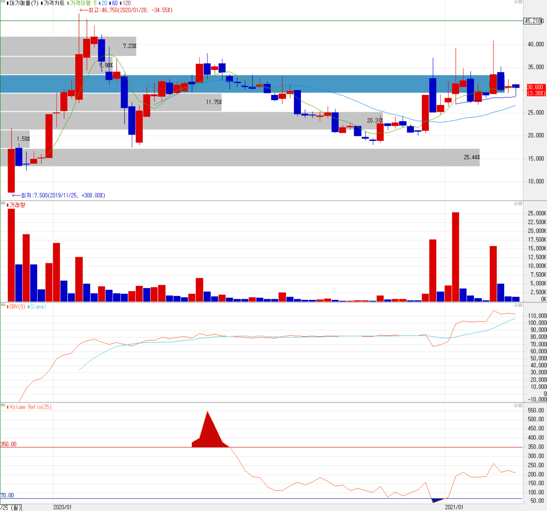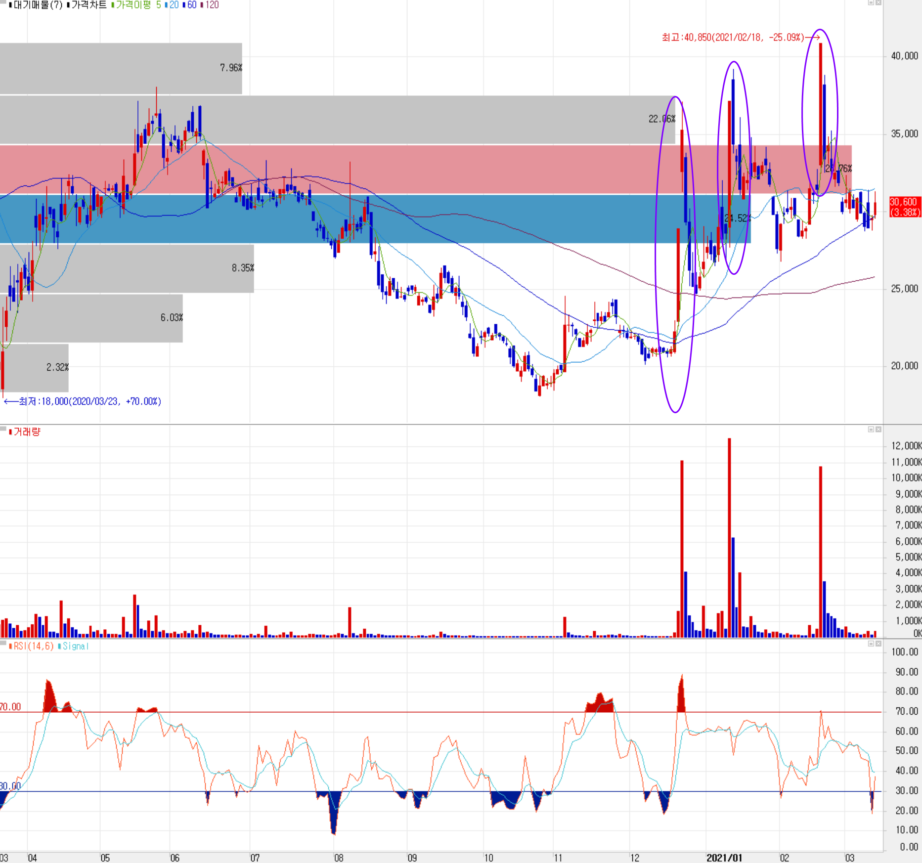 최근 한 달간 수급에서는 기관과 개인의 매수 우위에 외국인이 매도 우위를 보이고 있으나 거래량이 급격하게 감소하고 있습니다. 거래량이 감소해서 아직 큰 매물대를 돌파하기에는 어려움이 있어보이지만, 조만간 좋은 자리를 보여 줄 것 같습니다. 전체적으로 최근 3개월 주가 추이를 보면 테마에 의한 변동성이 상당히 큰 편이지만, 테마 관련된 소식의 대부분이 실적으로 연결될 소지가 많아 보입니다. 중기 추세도 유효한 것으로 판단되어 시장 조정 시 진입하기 좋은 종목으로 생각됩니다. 개인적인 목표 주가는 48,000원입니다.