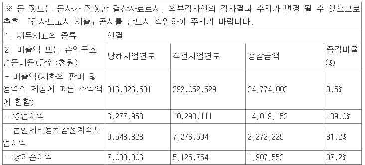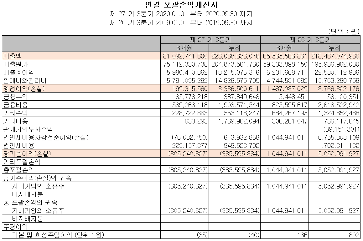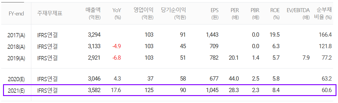 지난 2월 10일 당사 공시에 의한 2020년 잠정 실적은 매출액 3,168억 원으로 전년 대비 8.5% 증가했고, 영업이익은 63억 원으로 39% 감소, 당기순이익은 70억 원을 기록하면서 37.2% 증가했습니다.
