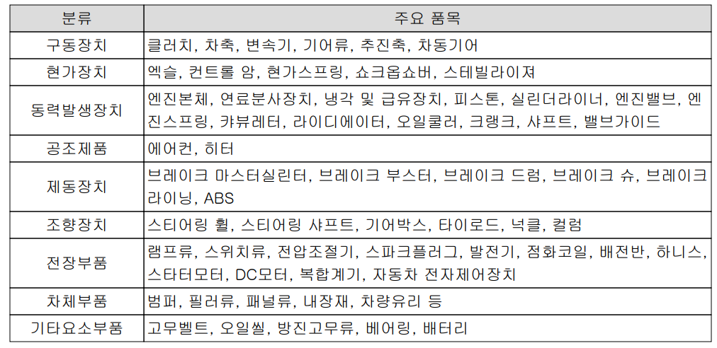 자동차 부품 산업은 동력발생장치, 구동부품, 현가 부품, 전장부품, 공조제품, 조향장치, 제동장치 차체부품 그리고 기타 부수적 요소에 사용되는 부품 등 수많은 부품을 제조하는 종합기계 산업으로 자동차 산업의 기술 경쟁력을 좌우하는 산업입니다.