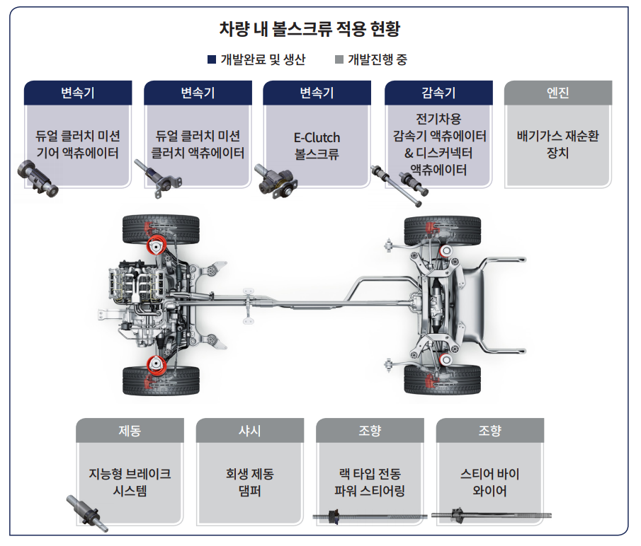 현재는 변속기, 감속기용 볼스크류를 개발, 생산하고 있으며 엔진, 제동, 샤시, 조향 시스템 등에 적용할 제품의 연구개발을 진행하고 있습니다.