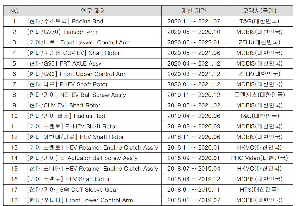 최근 3년간 다양한 구동 부품, 컨트롤 암 및 볼스크류에 대한 연구 개발을 수행하였습니다.