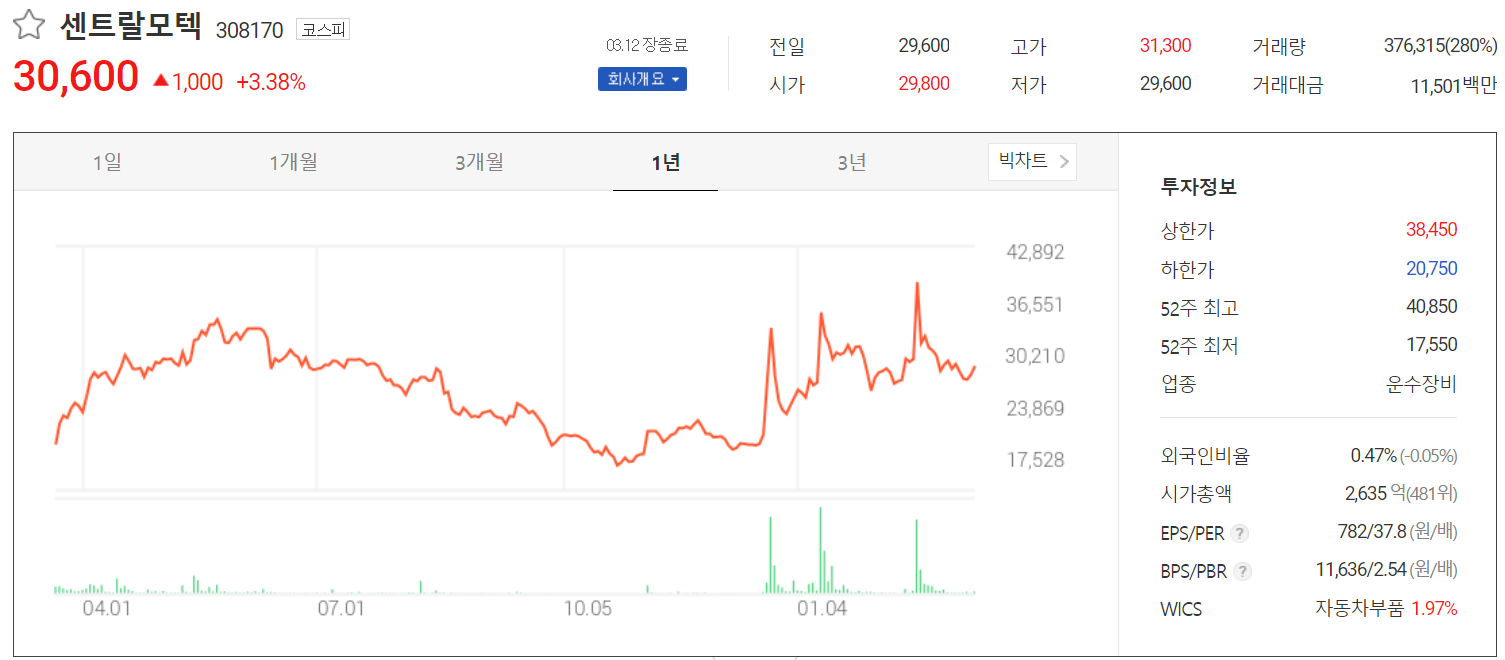 3월 12일 장종료 기준 당사의 주가는 30,600원에 거래를 마쳤습니다. 외국인 비중은 0.47%이며, 시가 총액 2,635억 원으로 코스피 시총 상위 481위 종목입니다.