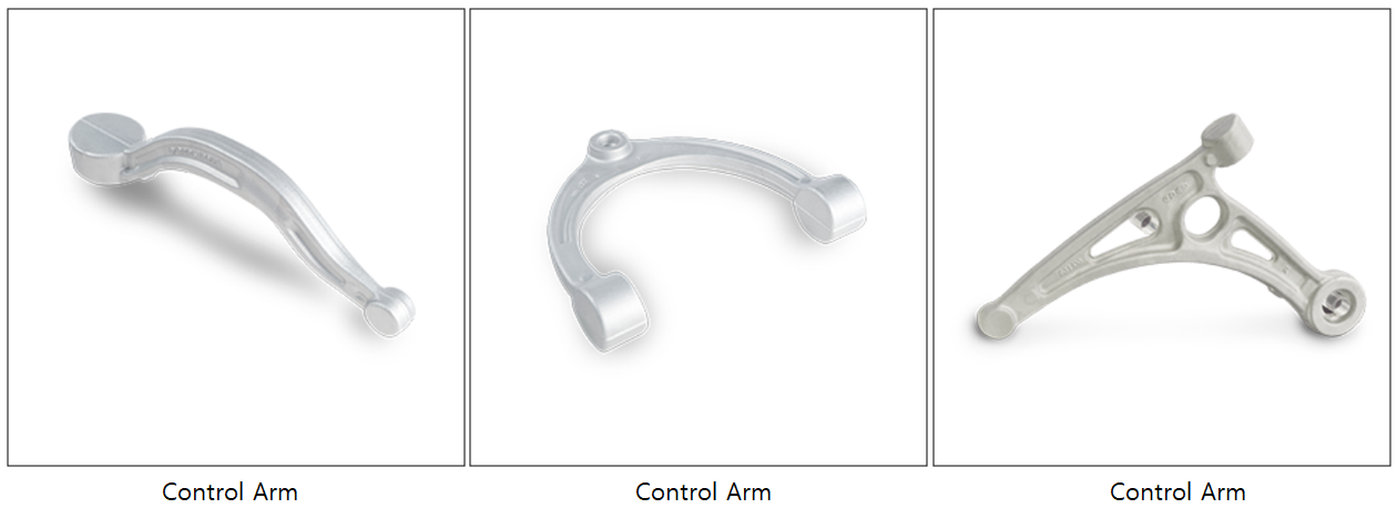 Control Arm은 현가장치(Suspension)의 구성품 중 하나로 휠의 수직 중심선이 정확하게 유지될 수 있도록 도와주며, 휠의 상하 움직임을 조절하는 역할을 합니다. 당사의 제품은 기존의 스틸 암에 비해 24% 경량화가 가능하며, 현재 현대자동차, 기아자동차의 전 차종 및 테슬라(S, X, 3, Y 모델 전체)에 당사의 컨트롤 암을 독점 공급하고 있을 뿐만 아니라, GM, BMW 등 해외 글로벌 자동차 업체를 대상으로 공급을 확대해 가는 중입니다.