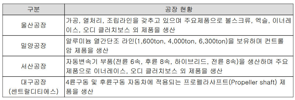 당사는 총 4개의 생산 설비가 있으며, 구동 부품 및 볼스크류를 생산하는 울산 공장을 주축으로 밀양, 서산 공장과 종속회사인 센트랄디티에스의 대구 공장 등이 있습니다. 특히 지난 2019년 말 밀양공장에서 안타까운 화재 발생으로 운영이 중단되었으나, 이제 복구가 완료되어 재 도약을 시작하고 있습니다.