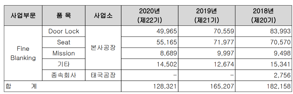 주요 제품 별 매출에서는 자동차 Seat Recliner 24.9%, Door Lock 20.2%를 차지하면서 당사 전체 매출의 40% 이상의 비중을 보이고 있습니다. 부문별로는 FINE BLANKING 사업부문 매출이 전체의 84%를 차지하고 있습니다.