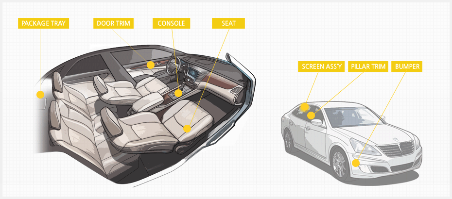 당사는 자동차 내장재 및 외장재를 위주로 생산, 공급하는 업체로써, Door Trim, Bumper, Console, Package Tray, Pillar Trim, Screen Ass'y, Seat 등을 주로 생산하고 있습니다.