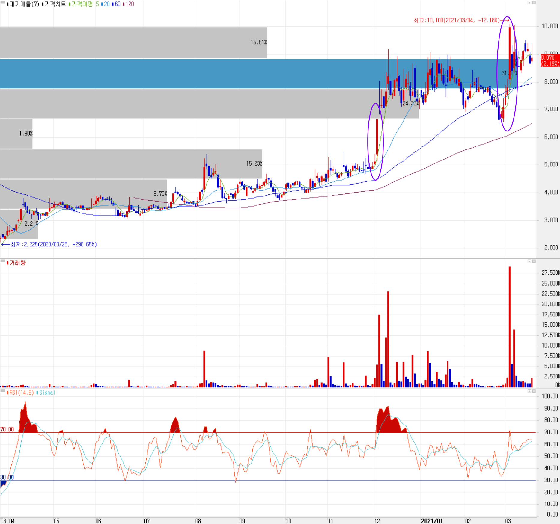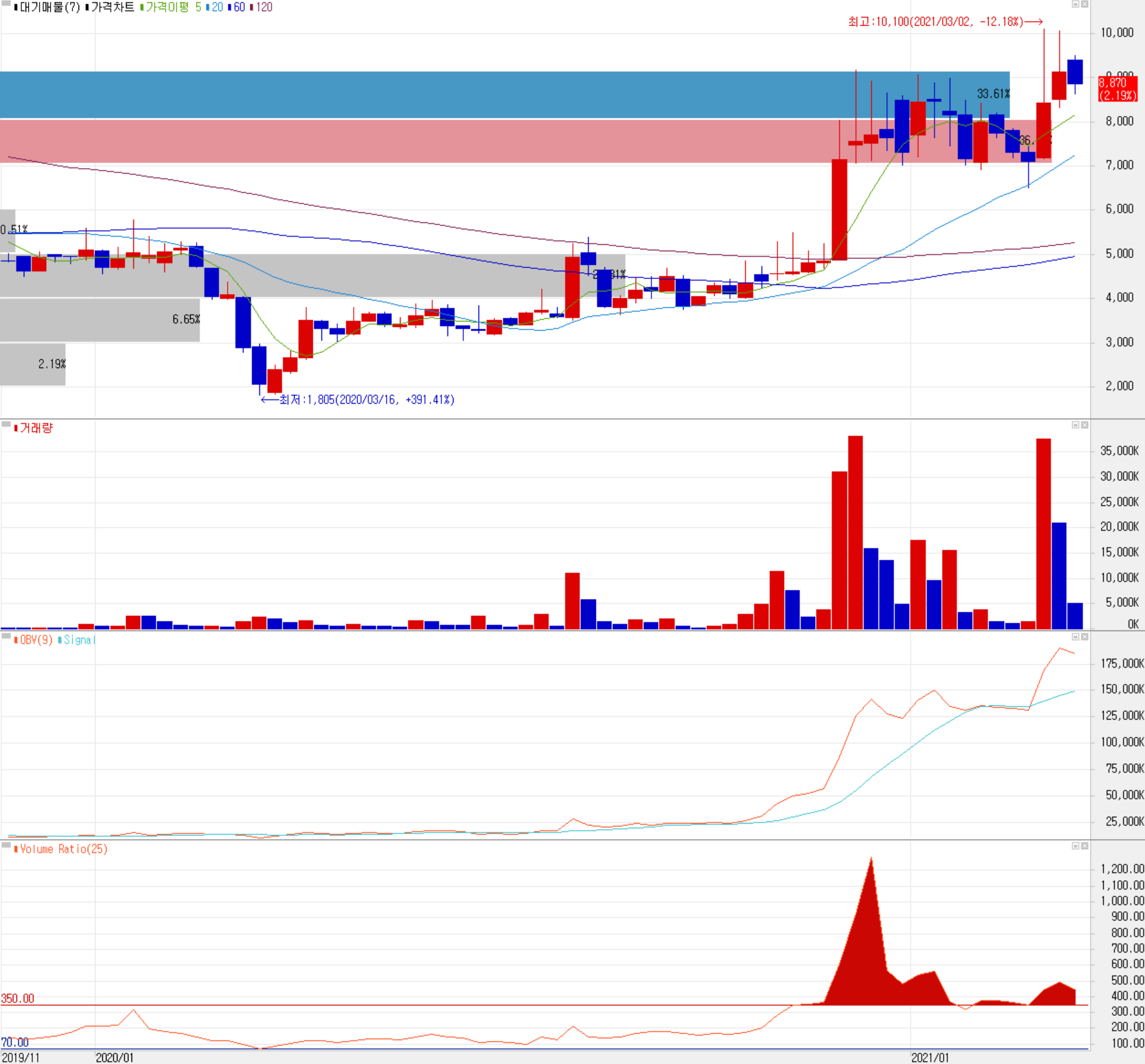 당사의 주가 추이를 보면, 지난 2020년 3월 코로나19 팬데믹에 의한 급락 이후 꾸준히 회복 추세를 보였지만 2019년 고점을 회복하지 못하다가 2020년 12월 들어서면서 급등하면서 레벨 업했습니다. 이후 한동안 박스권 장세를 보이다가 최근 들어 다시 한 번 시세분출을 하면서 연중 최고치인 10,100원까지 올랐습니다. 문제는 두 번의 시세 분출이 모두 윤석열 전 검찰총창 관련주로 묶이면서 나온 급등인데요, 개인적으로는 중장기 주가의 추이가 마음에 들지만 내용이 너무 좋지 않습니다. 개인적으로 정치테마주를 좋아하지 않기 때문이지만, 이런 테마는 언제든 되돌릴 수 있기 때문에 투자자의 주의를 요하는 부분입니다. 단기적으로 주가는 8,200 ~ 9,200원 사이에서 움직일 것으로 예상하며, 하락 시 6,500원까지도 열려 있는 것으로 생각합니다. 테마가 가라앉고 1분기 실적이 가시화될 때까지는 투자에 유의하는 게 좋을 것 같습니다. 기술적으로는 현재 자리가 나빠보이지 않으나, 시장의 변동성, 정치테마주에 둘러싸여 실적이 배제된 종목에서는 오히려 소액 단기 트레이딩으로 접근하는 게 맞을 것 같습니다. 다만 영업이익이 예년에 비해 100% 넘게 실적을 올렸다는 것은 2021년 실적 전망을 밝게하는 부분입니다.