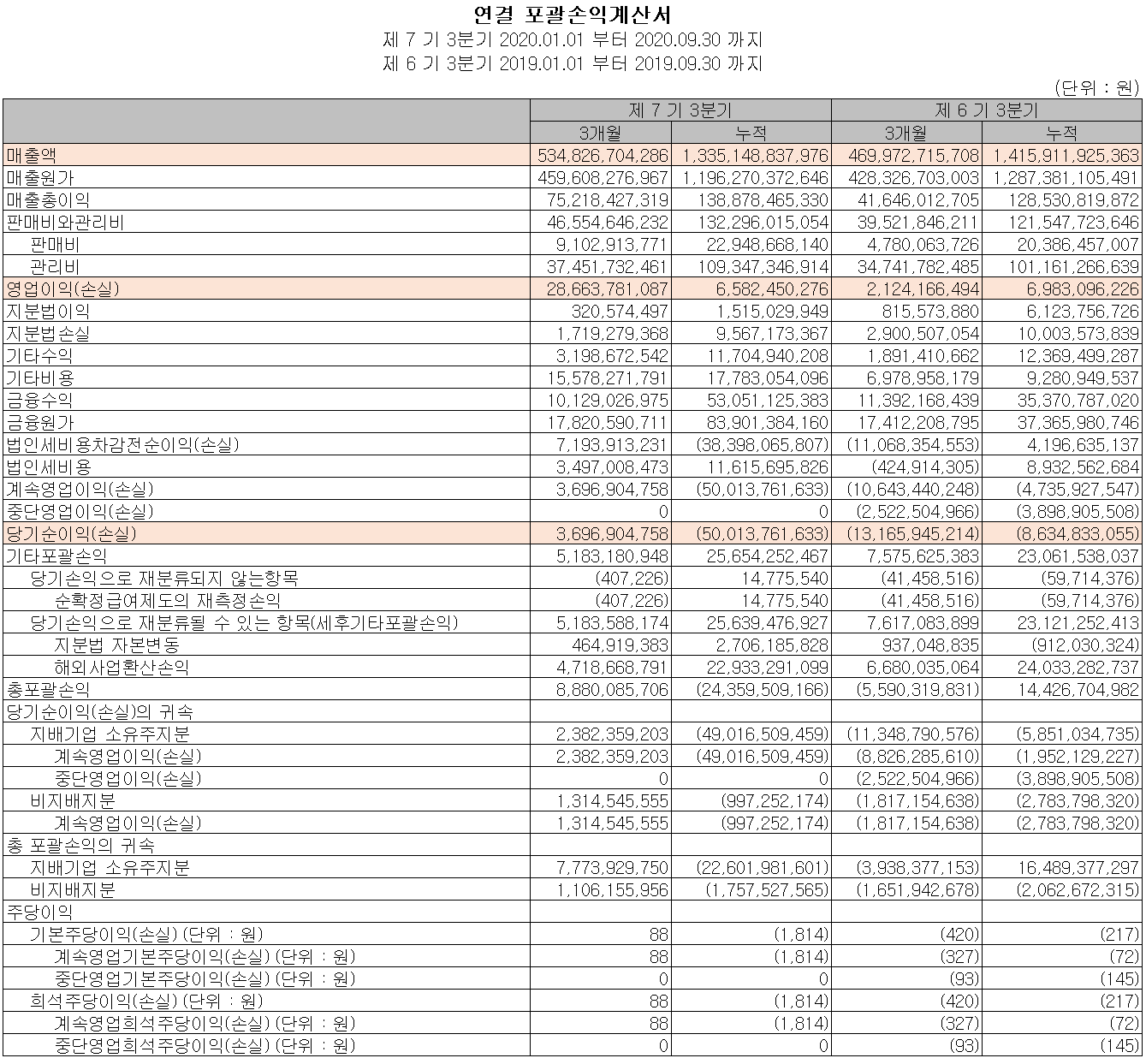 당사는 지난 3월 17일 공시를 통해 감사보고서를 제출했는데, 2020년 매출액은 1조 9624억 원으로 전년 대비 0.7% 감소했고, 영업이익은 485억 원으로 121.5% 증가했으나 당기순손실 규모는 408억 원으로 전년 대비 축소되었지만 적자지속입니다. 주요 요인은 2020년 신흥국을 위주로 한 외화 환율 변동에 따른 것으로 밝혔습니다. 당사의 해외 매출액 비중이 50%가 넘기 때문에 1조 원이 넘는 매출액에 대한 환차손이 상당 부분 차지하게 되었습니다.