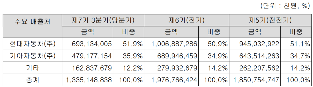 당사는 현대자동차와 기아자동차를 주요 고객사로 확보하고 있으며 폭스바겐, 벤츠, 포드, 닛산 및 북경기차 등 글로벌 완성차 업체에도 부품을 공급하며 고객사를 확대하고 있습니다.