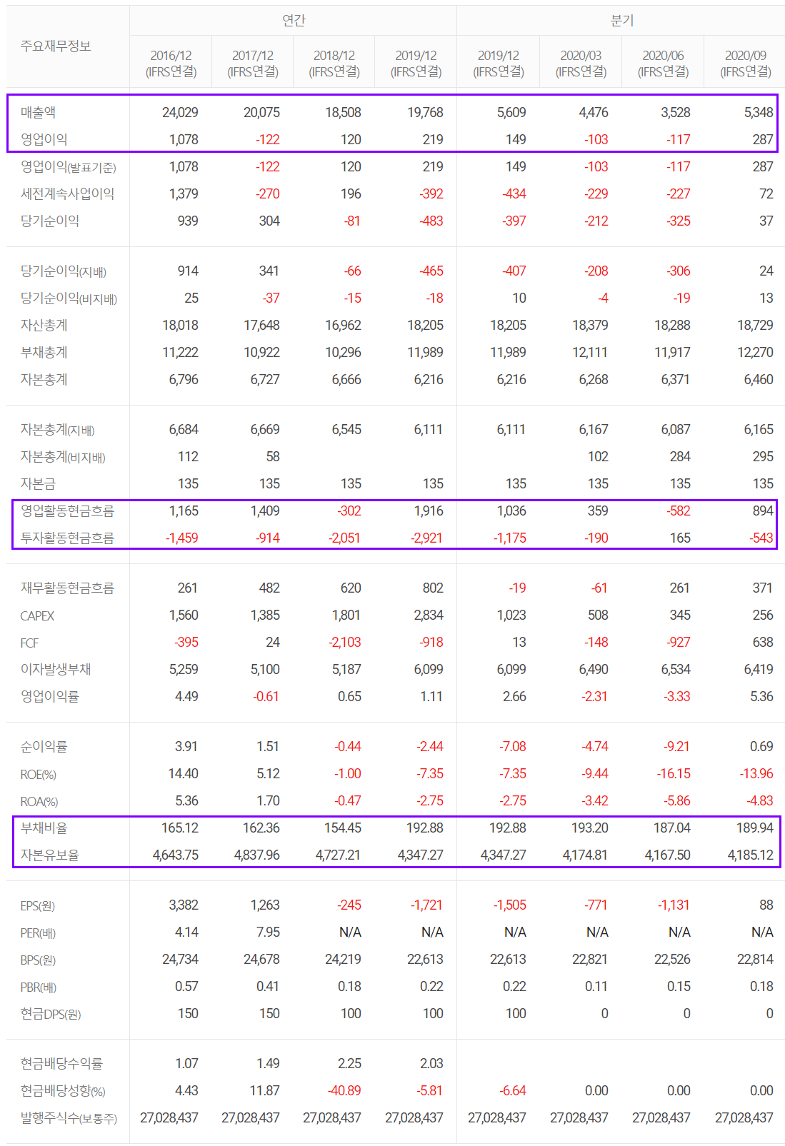 그나마 코로나19의 영향에 따른 전방산업의 부진 속에 1,2 분기 영업 적자를 기록했으나 3 부기부터 회복하는 모습이 긍정적입니다. 영업이익은 지난 3분기, 4분기 흑자 전환하였으며, 점차 환율 변동에 따른 실적 부진도 해소될 것으로 예상됩니다. 신용등급은 최근 3년간 하락하여 BBB, 현금흐름 등급은 보통 상태를 유지하고 있으며, 장단기 차입금 등을 통해 투자활동을 꾸준히 하고 있습니다.