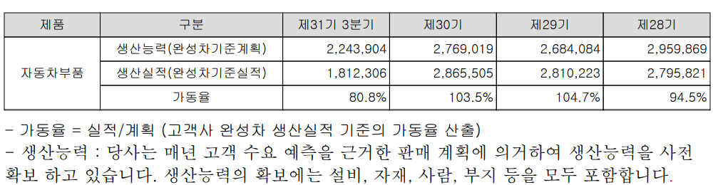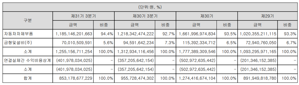 당사는 단일사업으로 자동차 차체에 대한 부품을 생산하고 있으며, 매출의 비중은 90% 이상을 차지하고 있습니다.