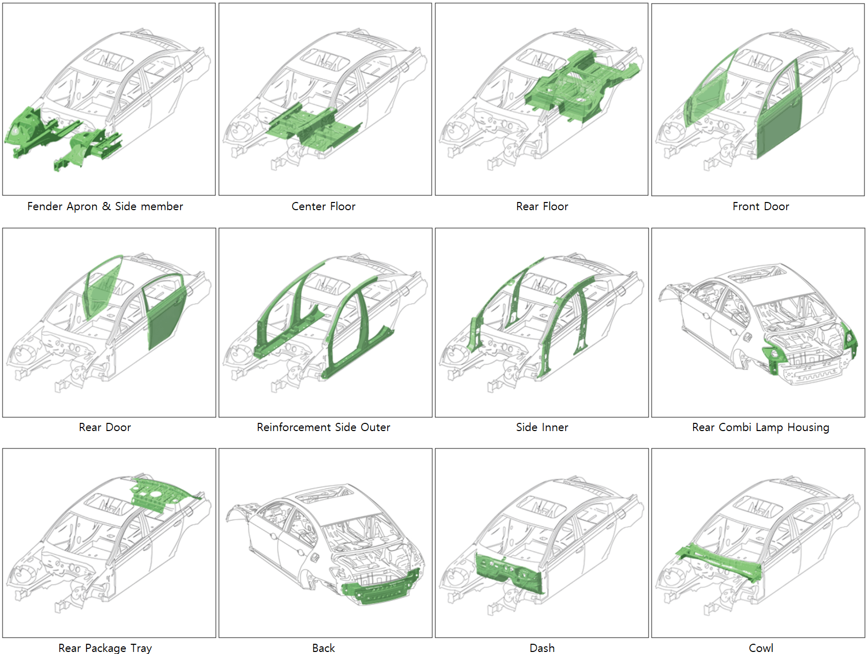 당사는 Fender Apron & Side member, Center Floor, Rear Floor, Front/Rear Door 등 자동차 차체의 모든 부품을 생산, 공급하고 있습니다.