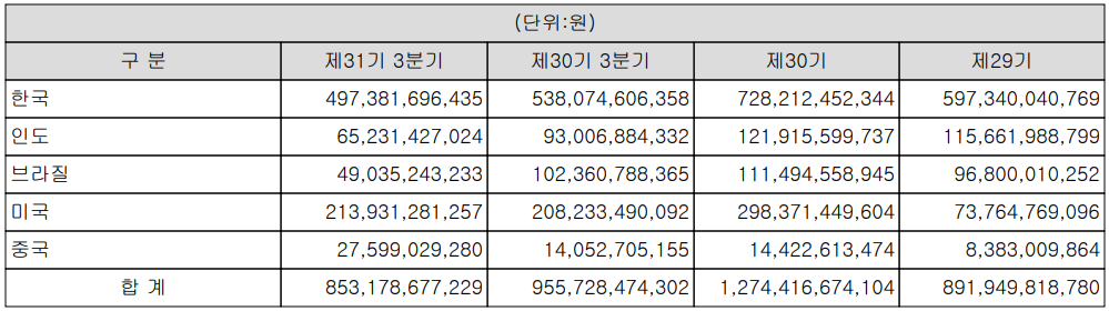 국가별 매출 현황에서는 한국이 58.2%, 인도 7.6%, 브라질 5.7%, 미국 25.1%, 중국 3.2% 등의 비중을 보이고 있습니다.