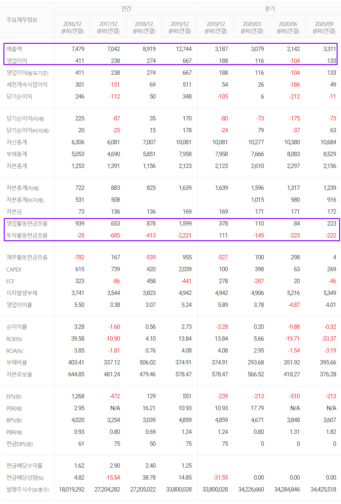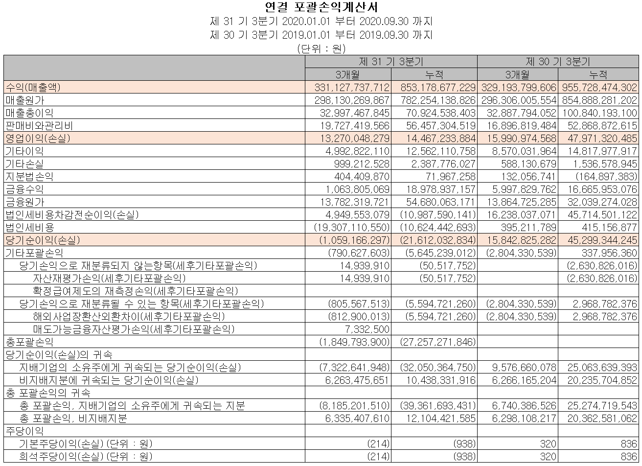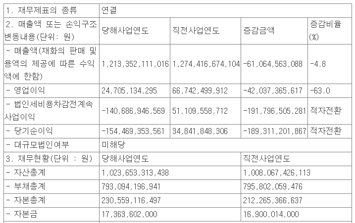 당사는 지난 2월 26일 공시를 통해 잠정 실적을 발표했는데, 2020년 연매출은 1조 2,134억 원으로 4.8% 감소했고, 영업이익은 247억 원으로 63% 감소, 당기순손실 1547억 원으로 적자 전환했습니다. 실적 부진의 요인은 코로나19의 영향에 따른 전방 산업의 수요 부진으로 매출 및 영업이익이 감소했고, 전환사채 및 전환우선주의 전환 대상 목적물인 보통주의 시가 상승에 따른 파생상품 부채의 평가손실이 증가하였습니다. 다만 회계상의 손실로 현금 유출 등은 없다고 밝혔습니다.