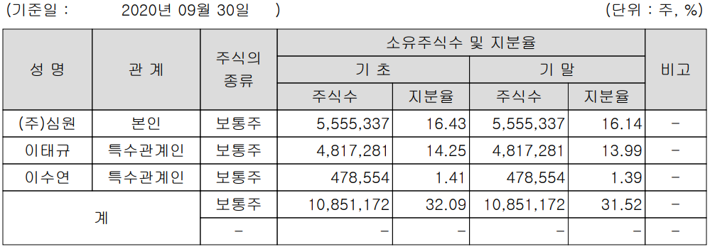 당사의 최대 주주는 (주)심원이며, 특수관계인 포함 31.52%의 지분을 보유하고 있습니다.