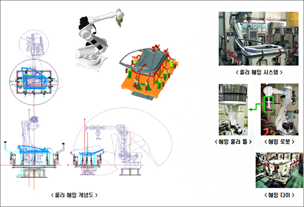 롤러 헤밍 공법은 다관절 로봇을 이용하여 부품의 판금 및 폴딩 등을 하는 공법으로써 다품종 소량 생산이 용이하며, 투자비를 절감할 수 있는 효과와 부품의 설계 자유도를 향상하는 효과가 있습니다.