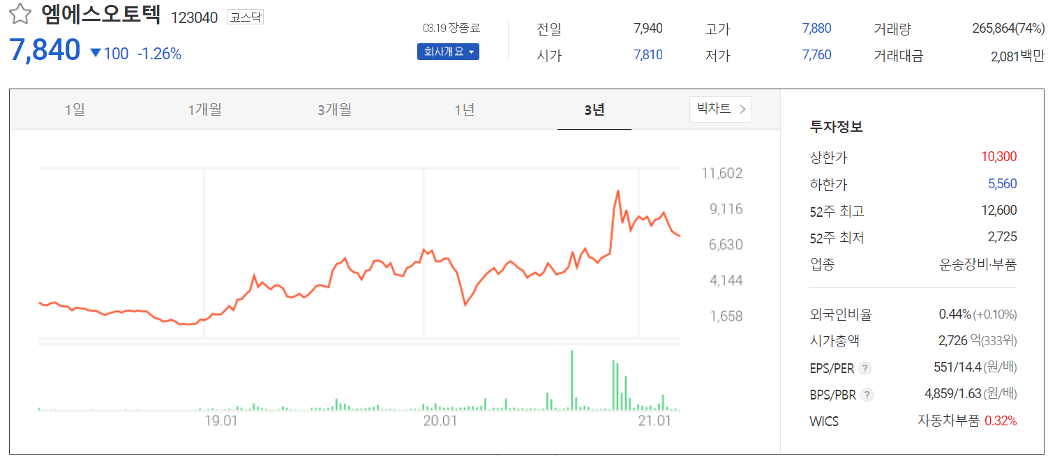 3월 19일 장 종료 기준 당사의 주가는 7,840원에 거래를 마쳤습니다. 외국인 비중은 0.44%이며, 시가 총액 2,726억 원으로 코스닥 시총 상위 333위 종목입니다.