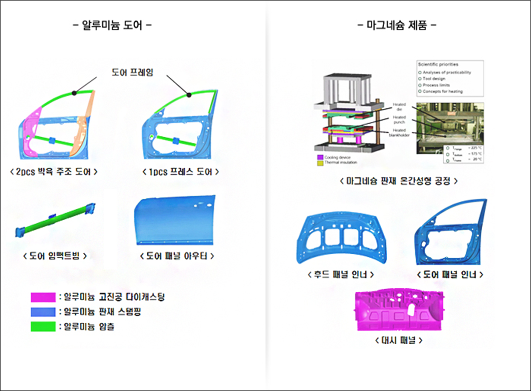 알루미늄 소재의 경우 구조해석을 통해 고진공 다이캐스팅, 판재 스탬핑, 압출 등을 통해 기존 제품 대비 40% 경량화를 구현합니다. 마그네슘 제품의 경우 온간성형 공법을 통하여 기존 제품 대비 40% 경량화를 실현합니다. 당사는 이종 소재의 용접 및 접합 기술과 강성 및 생산성을 확보하기 위한 연구개발을 지속하고 있습니다.