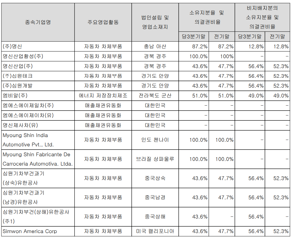 당사는 2020년 3분기 말 현재 15개의 종속회사를 보유하고 있으며 미국, 중국, 브라질, 인도 등 해외 현지 법인과 자동차 차체 부품에 대한 사업을 하는 (주)명신, 명신산업황성(주), 명신산업(주), (주)심원테크, (주)심원개발 등이 있습니다.