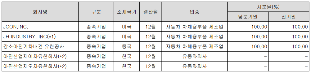 아진산업 종속기업 현황