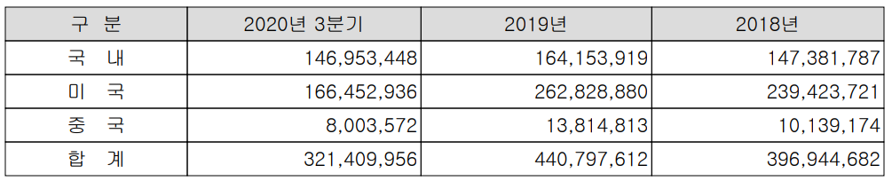 2020년 3분기까지는 코로나19의 영향으로 국내를 제외한 미국과 중국의 실적이 둔화되었습니다.