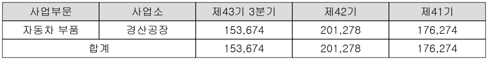 당분기 자동차 부품을 제조하는 국내 경산 공장의 가동률은 80.29%를 기록했습니다.