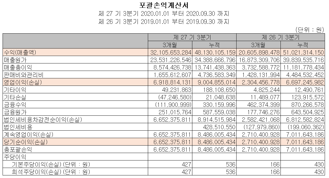 아직 연매출 실적 발표 전이지만, 2020년 3분기 누적 기준 매출액은 481억 원으로 전년 대비 5.7% 감소했고, 영업이익은 69억 원으로 34.4% 증가했습니다.