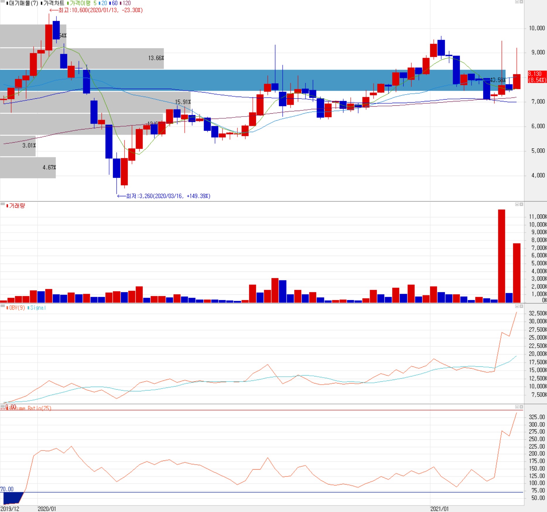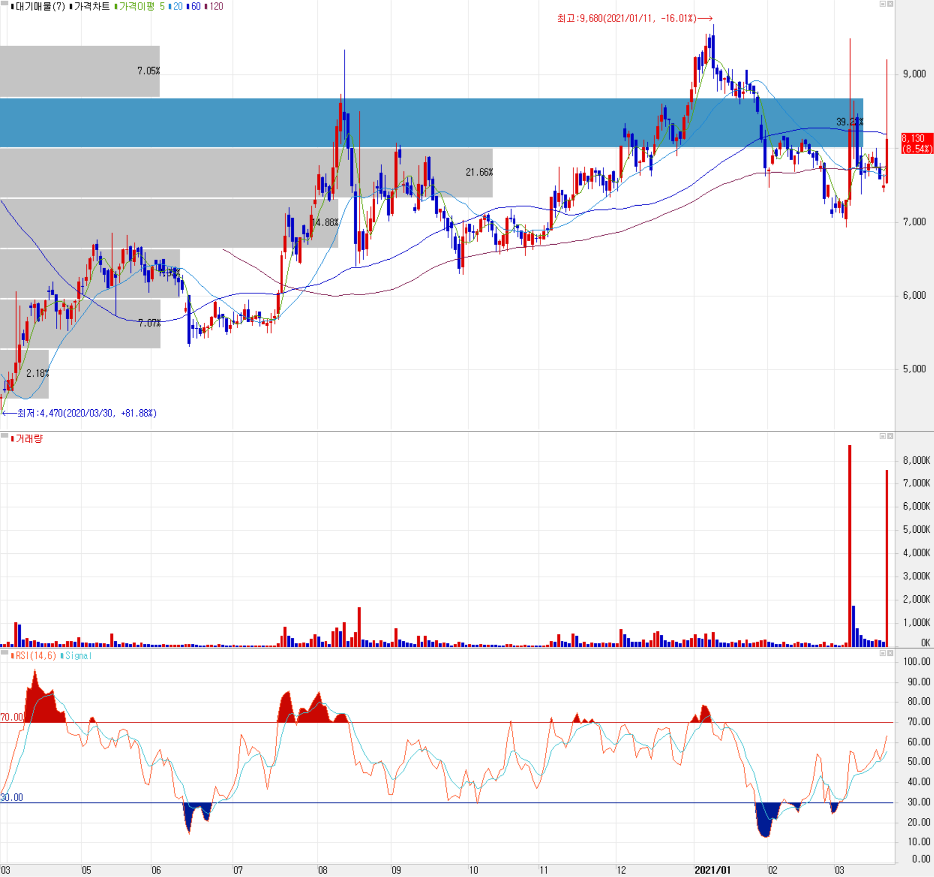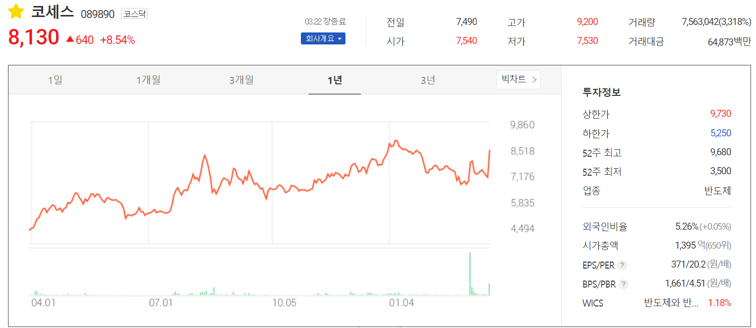 글 작성하는 오늘 메타버스의 핵심 구성 요소인 AR(증강 현실), VR9(가상현실)에 마이크로 LED가 필수라는 소식이 전해지면서 장중 한 때 9,000원을 돌파하기도 했습니다. 당사의 주가는 작년 코로나19 이후 정부 정책 테마 및 반도체 슈퍼사이클에 따른 소식 등으로 꾸준한 상승세를 보이다가 올해 1월 들어서면서 강한 조정을 받았습니다. 3월 들어서는 메타버스 등 미니 LED 시장에 대한 기대감이 부각되면서 국내 유일 마이크로 LED 레이저 리페어 장비를 공급하는 코세스의 주가가 출렁이고 있습니다. 최근 한 달간 수급에서는 기관의 움직임은 약한 가운데 개인의 매수 우위에 외국인은 팔자가 많습니다. 9,000원 돌파 시도할 때도 개인이 끌어올리면 외국인이 매물을 던져서 긴 윗꼬리를 두 번 형성을 했습니다. 조정 시 7,200원 근처에서 강한 지지를 받을 것으로 판단되며 최근 들어 저점을 조금씩 높이면서 상승하는 모습입니다. 3월 22일 메타버스 기대감에 오른 이후 며칠 정도는 관망이 필요할 것 같습니다. 개인적으로 2021년 최고 실적을 갱신할 것으로 판단하여, 목표주가는 10,500원으로 설정하고 대응을 준비할 예정입니다.