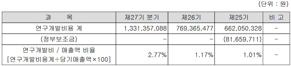 당사는 지난 2020년 연구개발 비용을 전체 매출의 2.77%를 투자하면서 점차 증가하는 추세입니다.