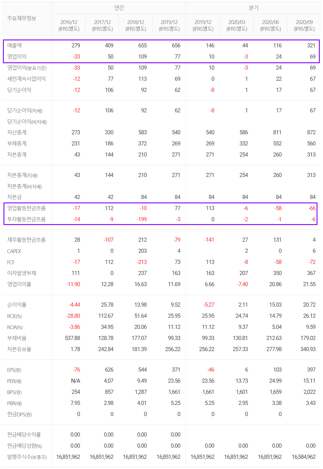 아직 연매출 실적 발표 전이지만, 2020년 3분기 누적 기준 매출액은 481억 원으로 전년 대비 5.7% 감소했고, 영업이익은 69억 원으로 34.4% 증가했습니다.