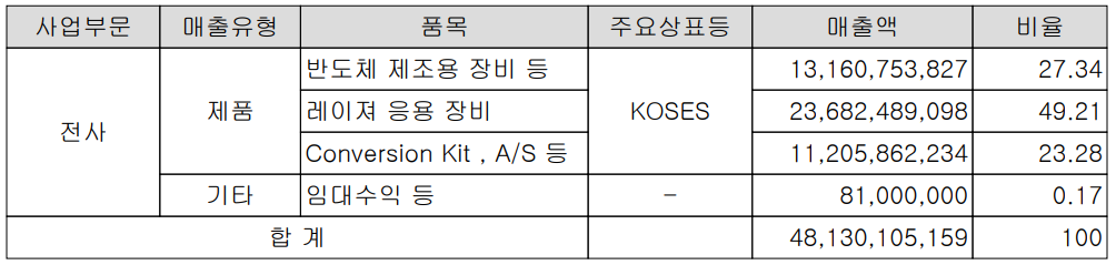 지난 2020년 3분기 말 기준 반도체 제조용 장비의 매출은 132억 원으로 전체 매출의 27.34%, 레이저 응용 장비의 매출이 237억 원으로 49.21%를 차지하고 있습니다.