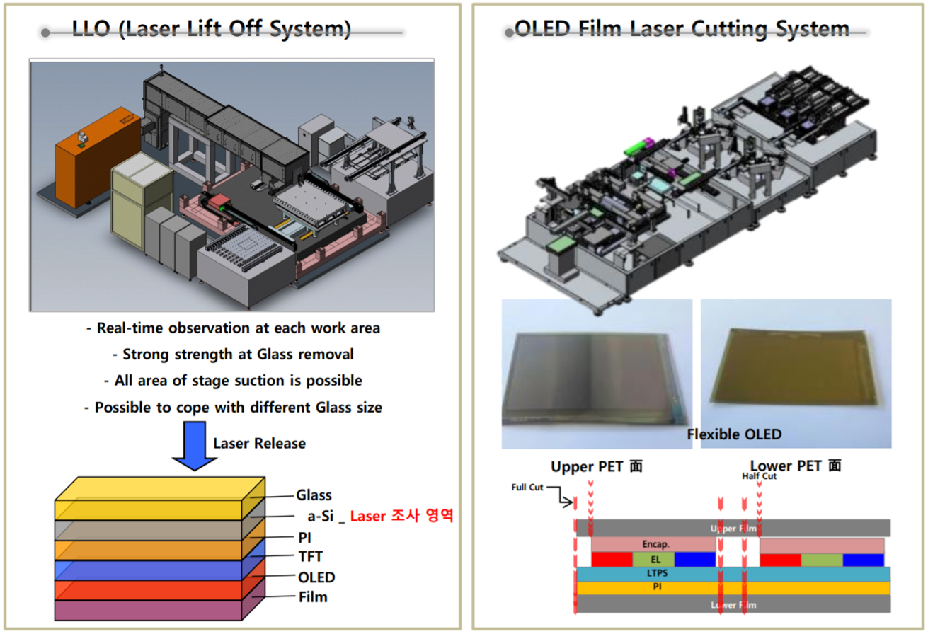 당사는 기존 사업영역에서 축적된 레이저 관련 기술을 바탕으로 OLED, Flexible Display, 지문인식센서, 카메라 모듈 등의 디스플레이 및 모바일 분야에 적용되는 레이저 가공 장비를 제조하고 있습니다. 레이저 가공장비는 자동차, 조선, 전기, 전지 등 다양한 분야의 정밀 부품을 제조하기 위한 필수 설비로 중요성이 점차 커지고 있으며, 화학물질이 필요 없는 친환경 공정으로 전통적 기계 가공의 대체 기술로 큰 관심을 받고 있습니다.