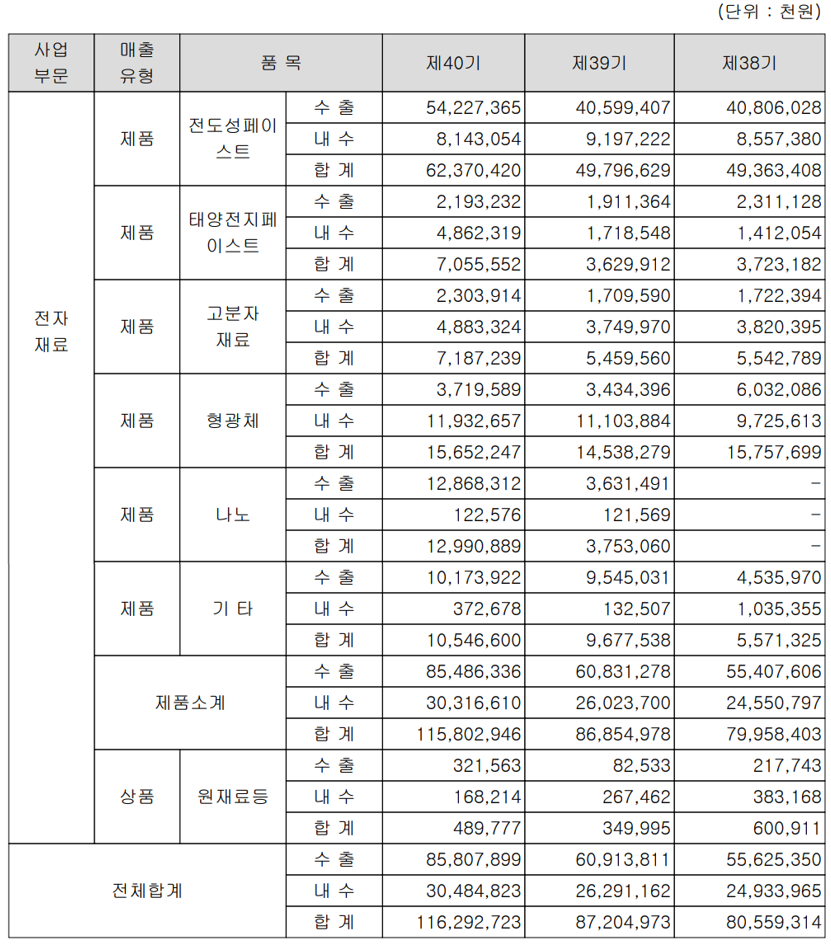 지난 2020년 연매출 기준 전도성 페이스트 부문의 매출액이 624억 원을 기록하면서 전체 매출액의 53.6%를 차지하여 당사의 주력 제품이고, 형광체 13.5%, 이차전지용 음극재 11.2%, 고분자 재료 6.2%, 태양전지 전극재료가 6.1%의 매출 비중을 기록했습니다.