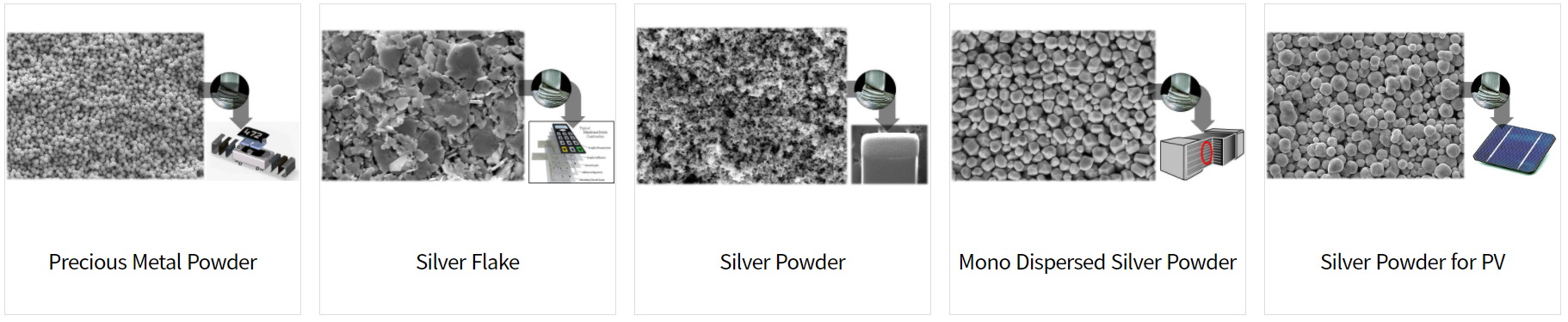 다양한 금속 재료를 이용한 분말로써 소자의 용도와 특성에 따른 페이스트에 적용됩니다.