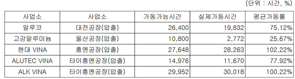 2020년 생산 실적에서는 고강알루미늄이 경영난을 겪으면서 가동률이 부진한 것 외에 기타 주요 공장의 가동률은 75% 이상을 기록했습니다.