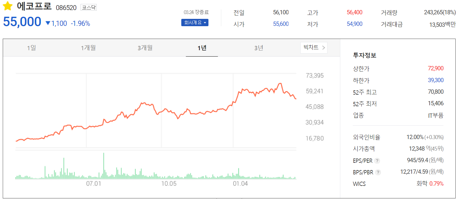 3월 24일 장종료 기준 당사의 주가는 55,000원에 거래를 마감했습니다. 외국인 비중은 12.00%이며, 시가 총액 1조 2,348억 원으로 코스닥 시총 상위 45위 종목입니다.