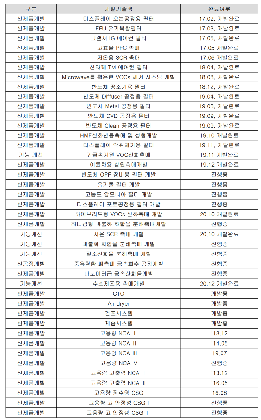 지속적인 연구개발에 대한 결과로 다양한 필터, 촉매, NCA 등 신제품 개발과 제품 개발에 필요한 새로운 공정 등 꾸준한 성과를 바탕으로 향후 당사 실적의 밑거름이 될 것으로 판단됩니다. 또한 당사의 사업과 연관된 80건의 특허를 확보하고 있으며, 꾸준한 연구 개발에 대한 진입 장벽을 구축하고 있습니다.