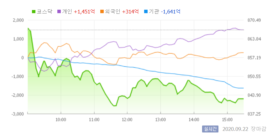 오늘 시장은 미중 갈등, 유럽 주요국들의 코로나 감염자 수 증가로 인한 재봉쇄 우려 등 국제적인 이슈로 하락했습니다. 증권사 신용 대출을 중단했음에도 불구하고, 개인투자자들은 코스피 코스닥 시장 합쳐서 1조 원 가까이 매수했습니다.