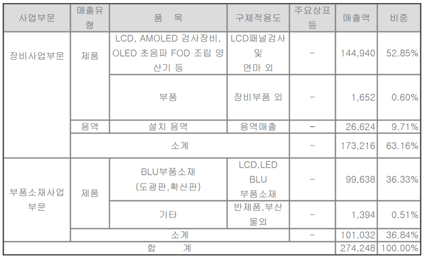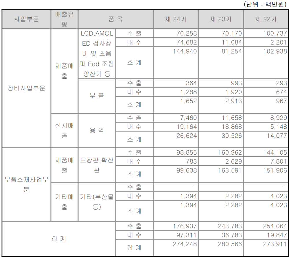 장비 사업 부문에서는 내수의 비중이 수출에 비해 비교적 높은 편이고, 부품 소재 사업부문에서는 수출의 비중이 99% 이상을 차지하고 있습니다. 특히 디스플레이 장비의 내수가 크게 증가하였으나, 도광판 및 확산판의 매출이 감소하면서 전체 실적이 소폭 감소하였습니다.