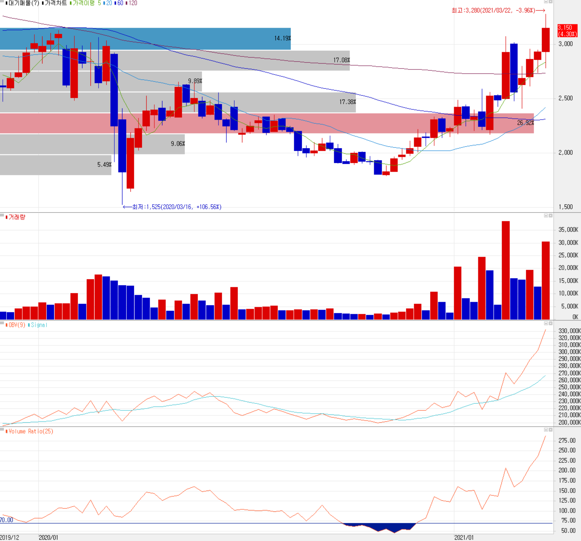당사의 주가 추이를 보면, 지난해 3월 코로나19 팬데믹으로 인한 급락 이후 6월까지 반등을 하면서 회복을 시도했으나 이제야 코로나19 이전 주가를 회복했습니다. 2019년 1월을 정점으로 지속적인 하락을 겪다가 코로나로 인한 재택근무 활성화로 인한 TV 및 PC 용 디스플레이 사업 호조, 정부 정책 등에 힘입어 전방 산업의 투자 분위기가 고조되면서 지금까지 꾸준한 우상향을 보이고 있고, 중국의 대형 디스플레이 업체들의 OLED 투자 소식이 최근 상승을 이끌고 있습니다. 중장기적으로 상승추세는 유효한 것으로 판단되지만, 과매수 구간에 진입한 것으로 보여 진입 시 신중한 판단이 요구됩니다. 조정 시 2,600원 선에서 지지가 예상되며, 개인적인 목표주가는 4,100원으로 설정하고 진입 시기를 고려 중입니다.
